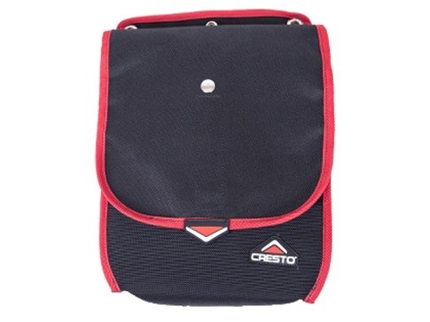 Materialväska i nylon med sidor av bälgtyp för större öppning. Inredd med hållare för fyra verktyg. Lock med kardborrelåsning. Locket kan låsas i öppet läge med tryckknapp.