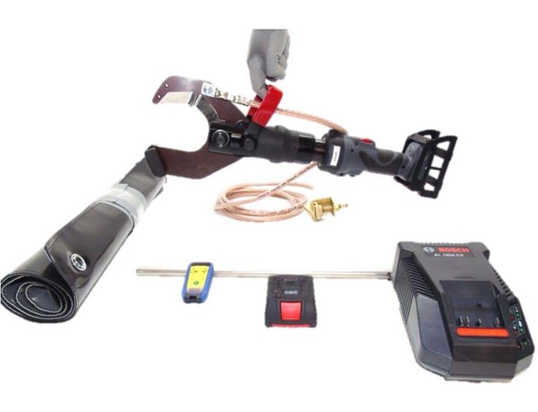En ny batteridriven säkerhetsklipp för att med fjärrstyrning kunna klippa en kraftkabel och avlägsna sig fysiskt i det fall en kabel med spänning och last klipps och ljusbåge uppstår. Kabelsaxen jordas innan klippning påbörjas för att snabbt leda bort eventuell kortslutningsström. Härdade skär klarar armering och stålband på äldre papperskabel.