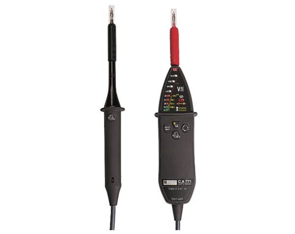Spänningsprovare för mätning upp till 1000V AC/1400V DC med autotest enligt EN 50110-1. För helautomatiska lågimpedans spänningsmätningar med frekvenser från 16 2/3 Hz upp till 800 Hz. Med praktiska extra funktioner som ficklampa, fasidentifiering, 2-tråds fasföljdskontroll, summer och resistansmätning samt inbyggd jordfelsbrytartest (30 mA). Med LED display bestående av 9 olika segment från 12 V. 1000V AC / 1400V DC. CA773 har dessutom bakgrundsbelyst digital display med 4 siffror samt LED indikering, för enkel och exakt mätning och avläsning.