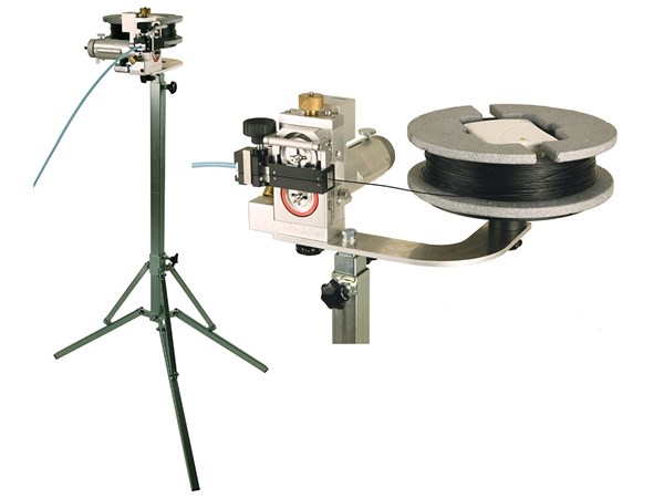 Elförzinkat golvstativ till UltimaZ, som är utformat för jetting, skjuta/dra inomhus, och förenklar installationen av blåsfiber genom att hållaren för blåsfibern sitter i direkt anslutning till UltimaZ för en kvalitetssäkrad inblåsning. Stativet är hopfällbart och teleskopiskt.