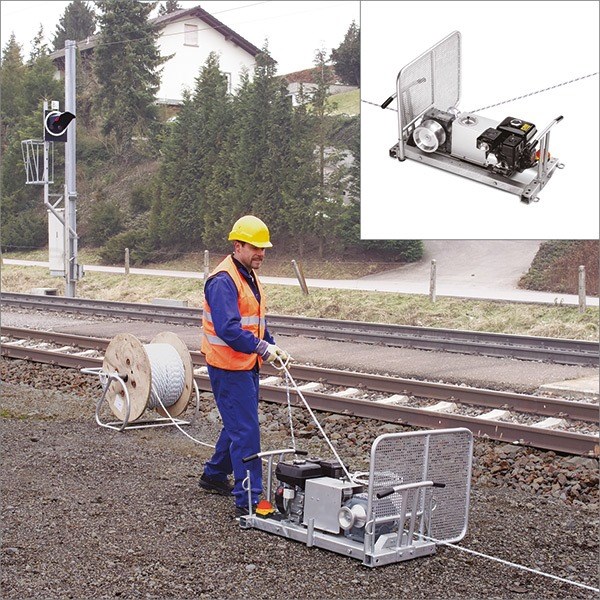 Nockvinsch med bensinmotor. Portabel vinsch byggd på på ram och med däck för enkel transport som tillval. Vinschen är utrustad med två nockhjul, se teknisk data nedan.