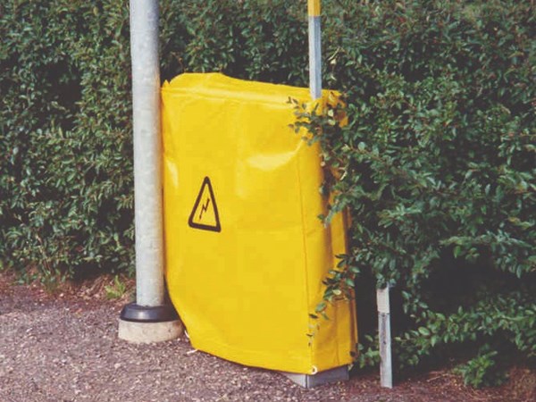 En skyddshuv tillverkad av glasfiberarmerad duk i plast för att täcka ett skadat kabelskåp. Huven är försedd med dragsnöre nedtill för att fixera huven på kabelskåpet. Spänningsvarning (triangeln med blixten) är tryckt på båda sidor. Finns i olika grundstorlekar enligt tabellen nedan.